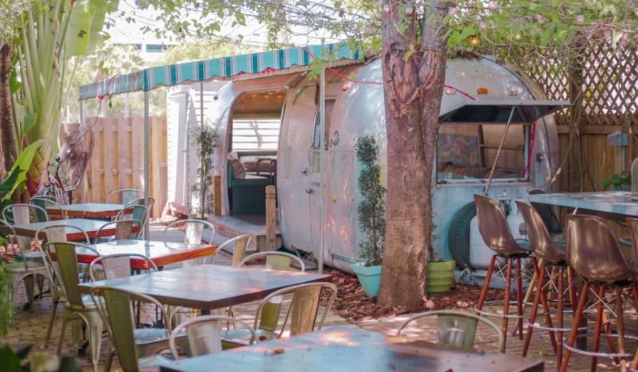 Inside, the decor is minimal - think New York City loft meets Little Italy with framed black and white photos of iconic rock stars that caused a "hullabaloo" back in their day.  Outside, there's bistro dining right on Clematis and out on the back patio, you'll find a repurposed, vintage Airstream camper that doubles as a dining space!